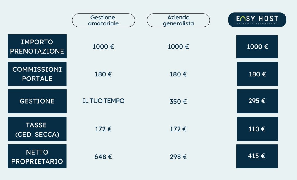 Ipotizziamo una prenotazione totale di € 1000 e confrontiamo 3 tipologie di gestione differenti: una effettuata direttamente dalla proprietà (o amatoriale), una da parte di un’agenzia generalista, e infine la gestione Easy Host, specializzata esclusivamente in affitti brevi.